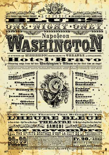 Napoleon Washington, faisant corps avec sa Fine Resophonic, a trouvé le son organique, métallique qui lui convenait. Seul ou accompagné de musiciens, l’harmoniciste Bonny B, le batteur Speedy Jeanrenaud, le bassiste Marc Waeber ou les magnifiques choeurs de Diana jirkuff, la voix se fait incantatoire et donne la chair de poule, de cette poule dont on a coupé les pattes pour en faire des amulettes.